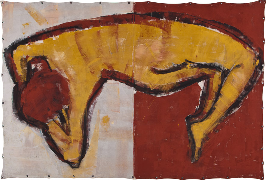 Here are some large-scale tarp paintings illustrating this point, from 2012, mixed-media on 6’x8′ unstretched canvas.