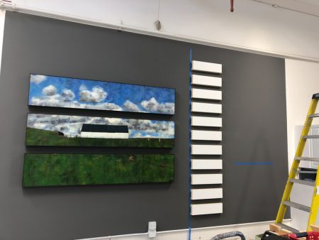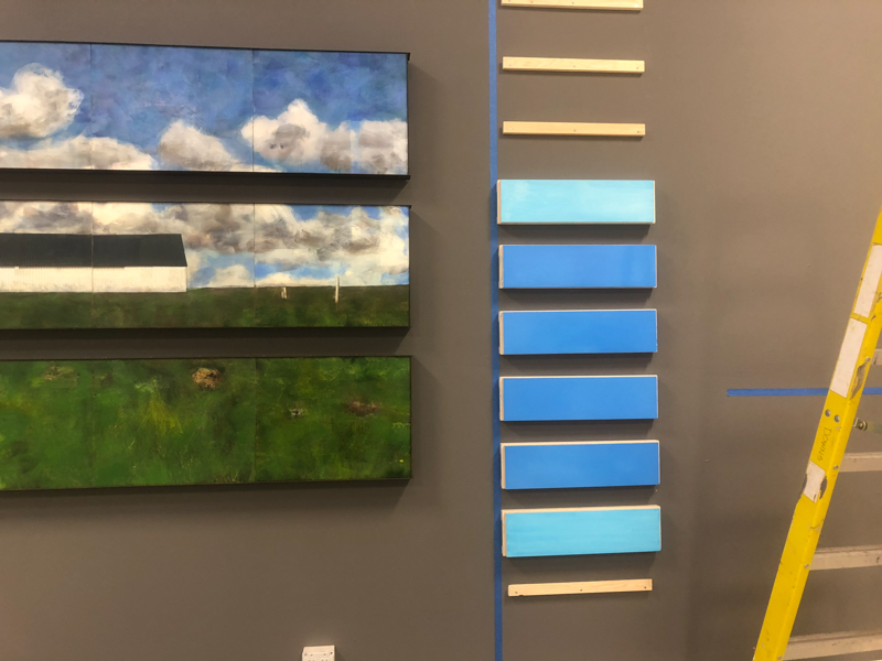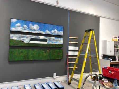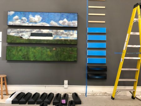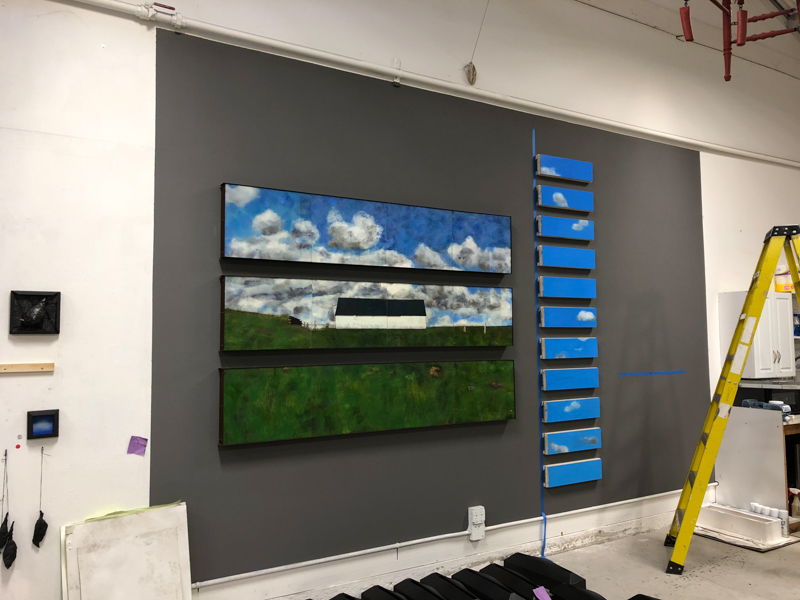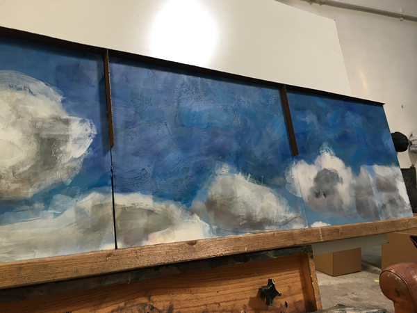 Because this year’s series followed directly on what I did last year, I’ll explain that one first. Nothing But Blue Skies was comprised of two components, birds and skies; buyers could mix and match individual pieces as they liked. But I always envisioned them hanging together as seen here.