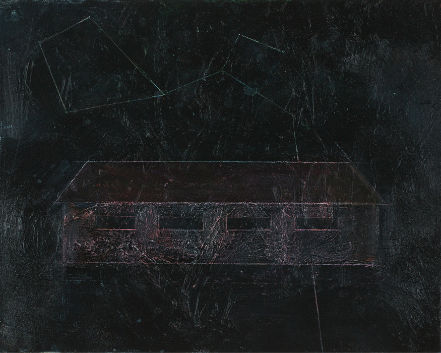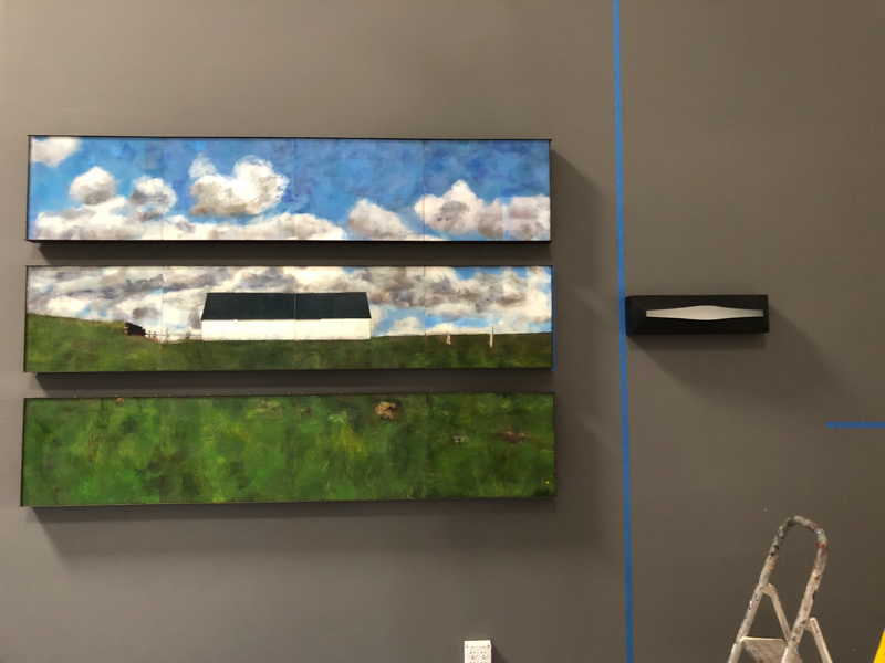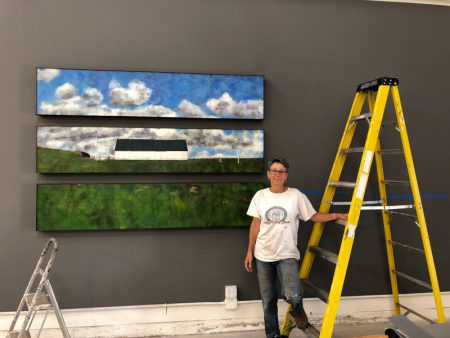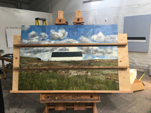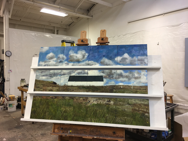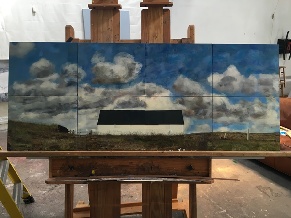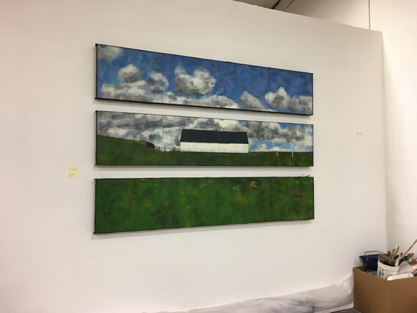 And, finally, something a little new, perhaps moving me into another direction: a barn with the addition of a figure. I haven’t done much figurative work for a while, so it was interesting to go back to the figure; I found that I wanted to work it in a flattened manner like the landscape work I’ve been doing.