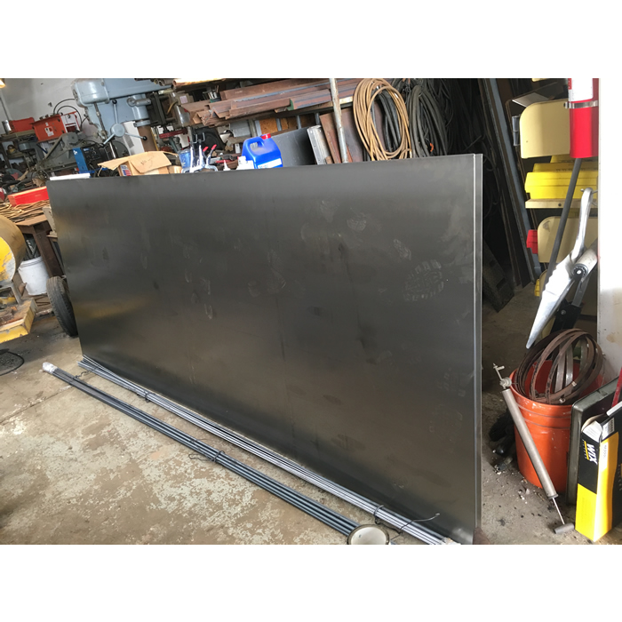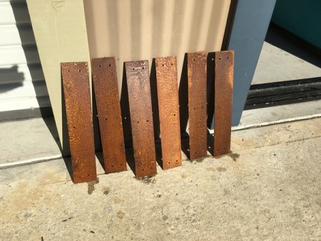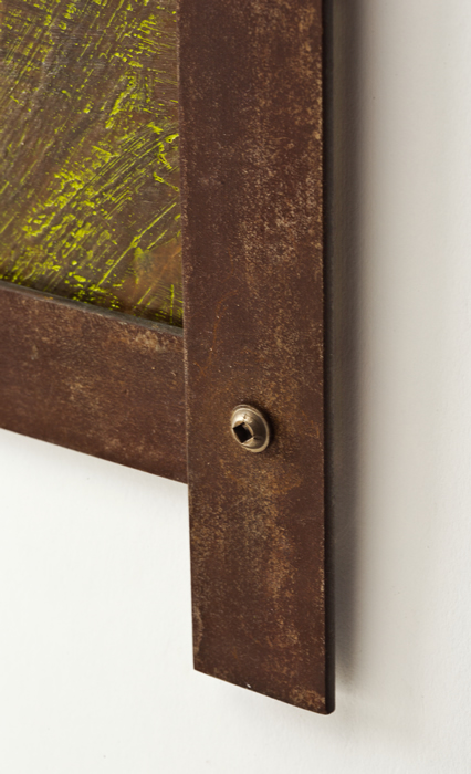 This next one is encaustic on paper, but because the image itself is such a flat rendition of a barn, I wanted it to sit flat on the wall. So that ruled out a conventional frame that adds depth. Instead, I made a rust-patina steel frame that screws the drawing directly onto the wall.