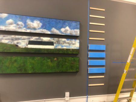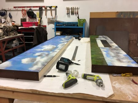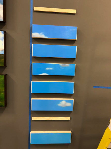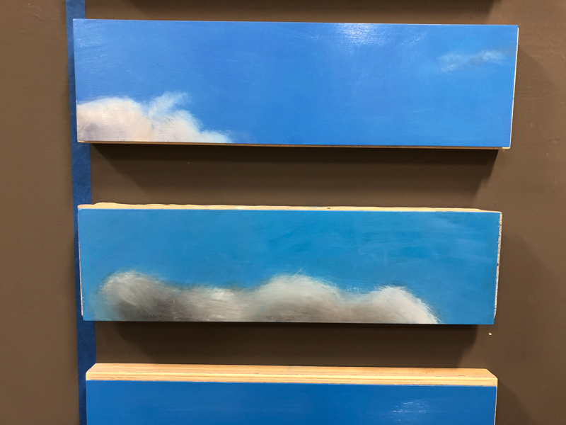Nothing But Blue Skies, and detail view, oil on wood panels with steel frames, 96″ x 22″ x 4.75″ , 2018
