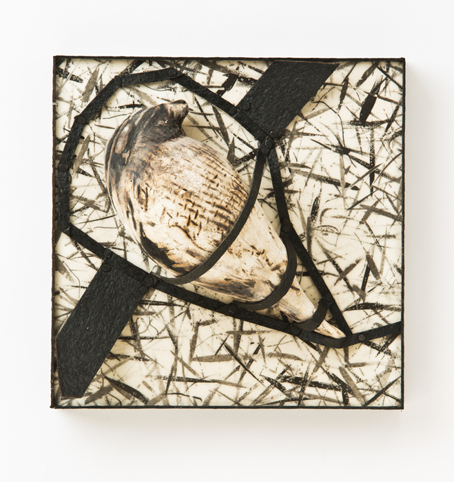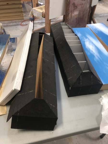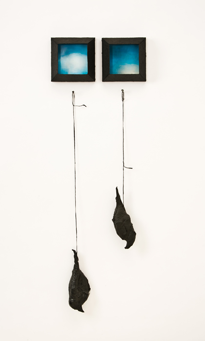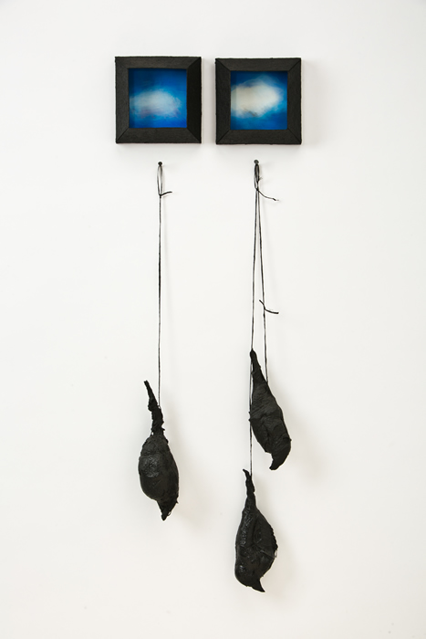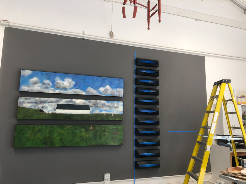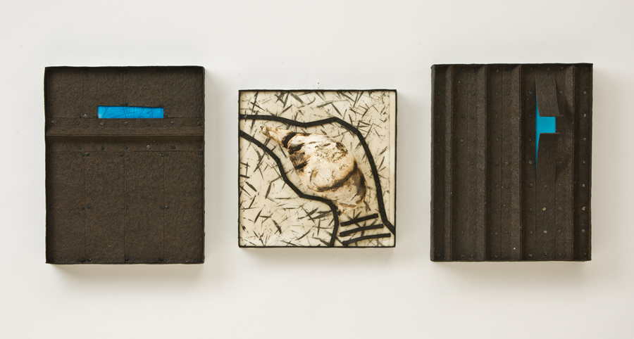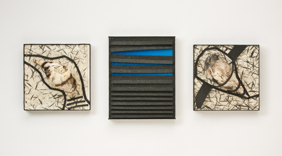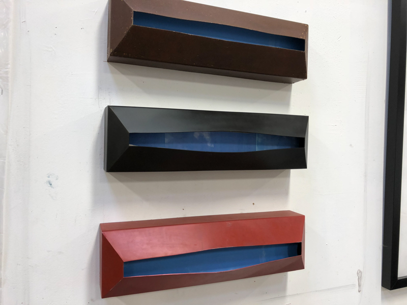 The “skies” are small encaustic panel constructions that are framed with a construction material that is stiffened with a specialty paint, and the “birds” are mixed-media with that same paint.