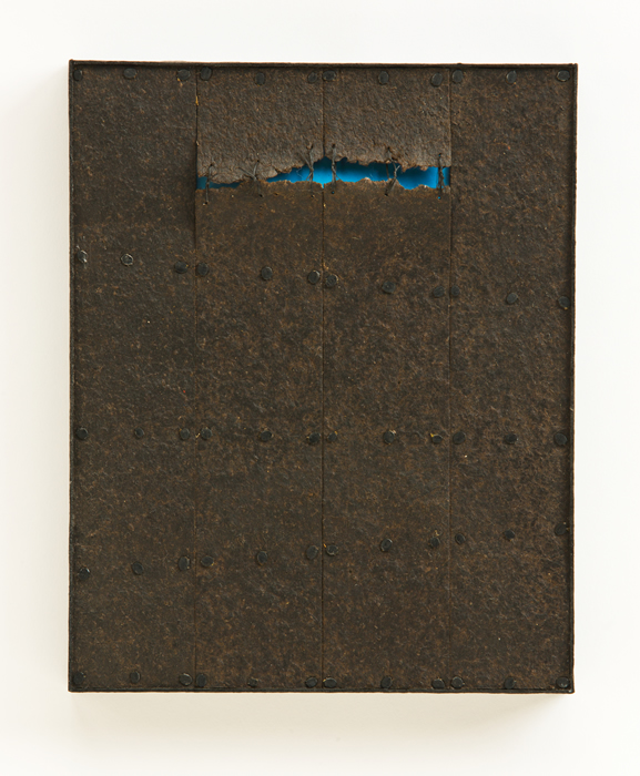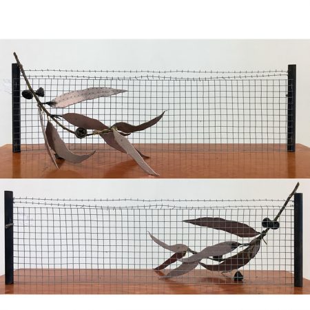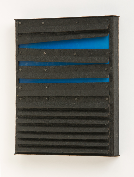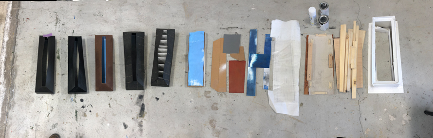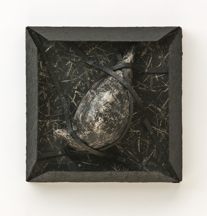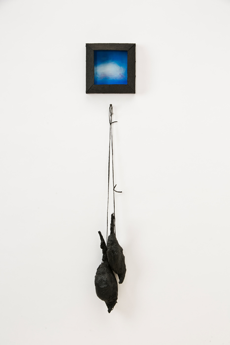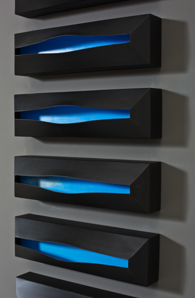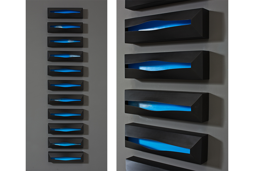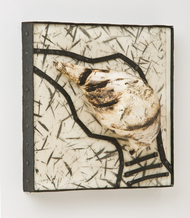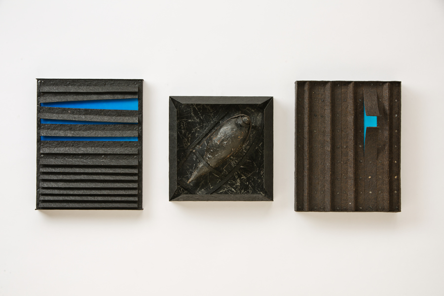 The “skies” are small encaustic panel constructions that are framed with a construction material that is stiffened with a specialty paint, and the “birds” are mixed-media with that same paint.