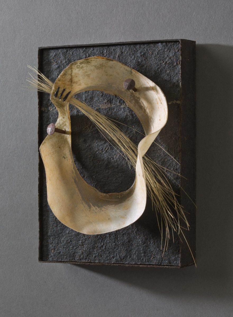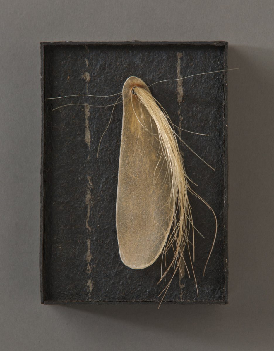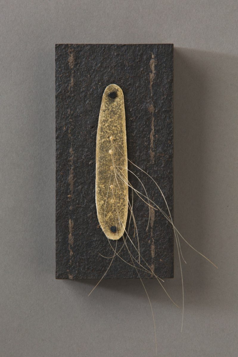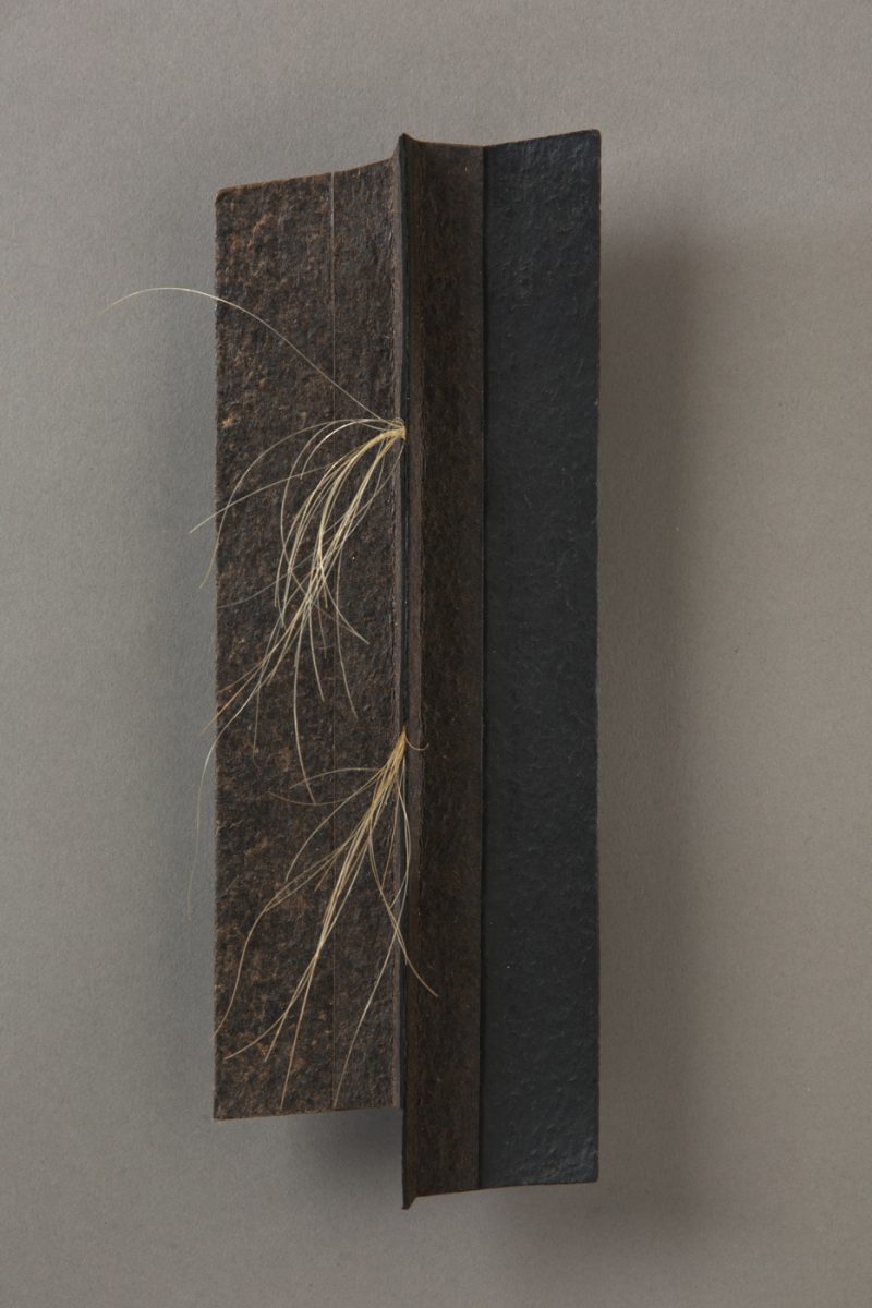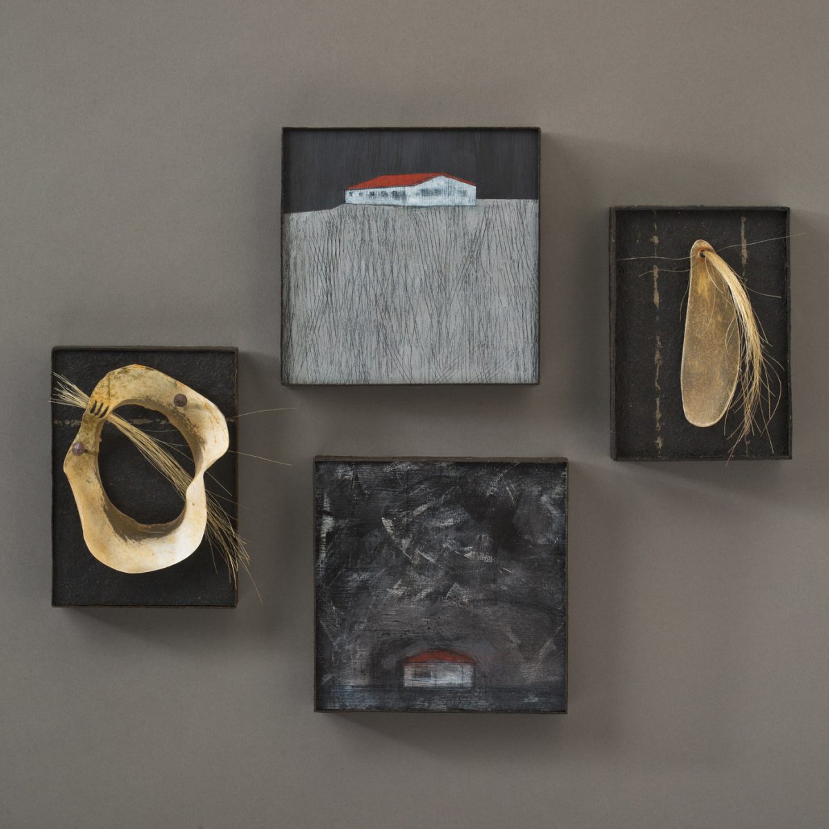 Clockwise from top: Outside #6, Inside #4, Outside #2, Inside #6, all mixed-media on panel, 2019, photo by R.R. JonesOutside #1, mixed-media on panel with tar paper frame, 6" x 6", 2019, private collection, photo by R.R. JonesInside #1, tar paper, horsehair on panel, 10" x 4" x 4", 2019, photo by R.R. JonesInside #2, tar paper, horsehair on panel, 9" x 3" x 2.5", 2019, private collection, photo by R.R. JonesOutside #2, mixed-media on panel with tar paper frame, 6" x 6", 2019, private collection, photo by R.R. JonesOutside #3, mixed-media on panel with tar paper frame, 6" x 6", 2019, private collection, photo by R.R. JonesInside #3, tar paper, horsehair, rawhide on panel, 6" x 3" x 3", 2019, photo by R.R. JonesInside #4, tar paper, horsehair, rawhide on panel, 6" x 4.25" x 3.5", 2019, photo by R.R. JonesOutside #4, mixed-media on panel with tar paper frame, 6" x 6", 2019, private collection, photo by R.R. JonesInside #5, tar paper, horsehair, rawhide on panel, 7" x 4" x 2", 2019, photo by R.R. JonesOutside #5, mixed-media on panel with tar paper frame, 6" x 6", 2019, private collection, photo by R.R. JonesOutside #6, mixed-media on panel with tar paper frame, 6" x 6", 2019, private collection, photo by R.R. JonesInside #6, tar paper, horsehair, rawhide on panel, 6" x 4.25" x 2", 2019, private collection, photo by R.R. Jones